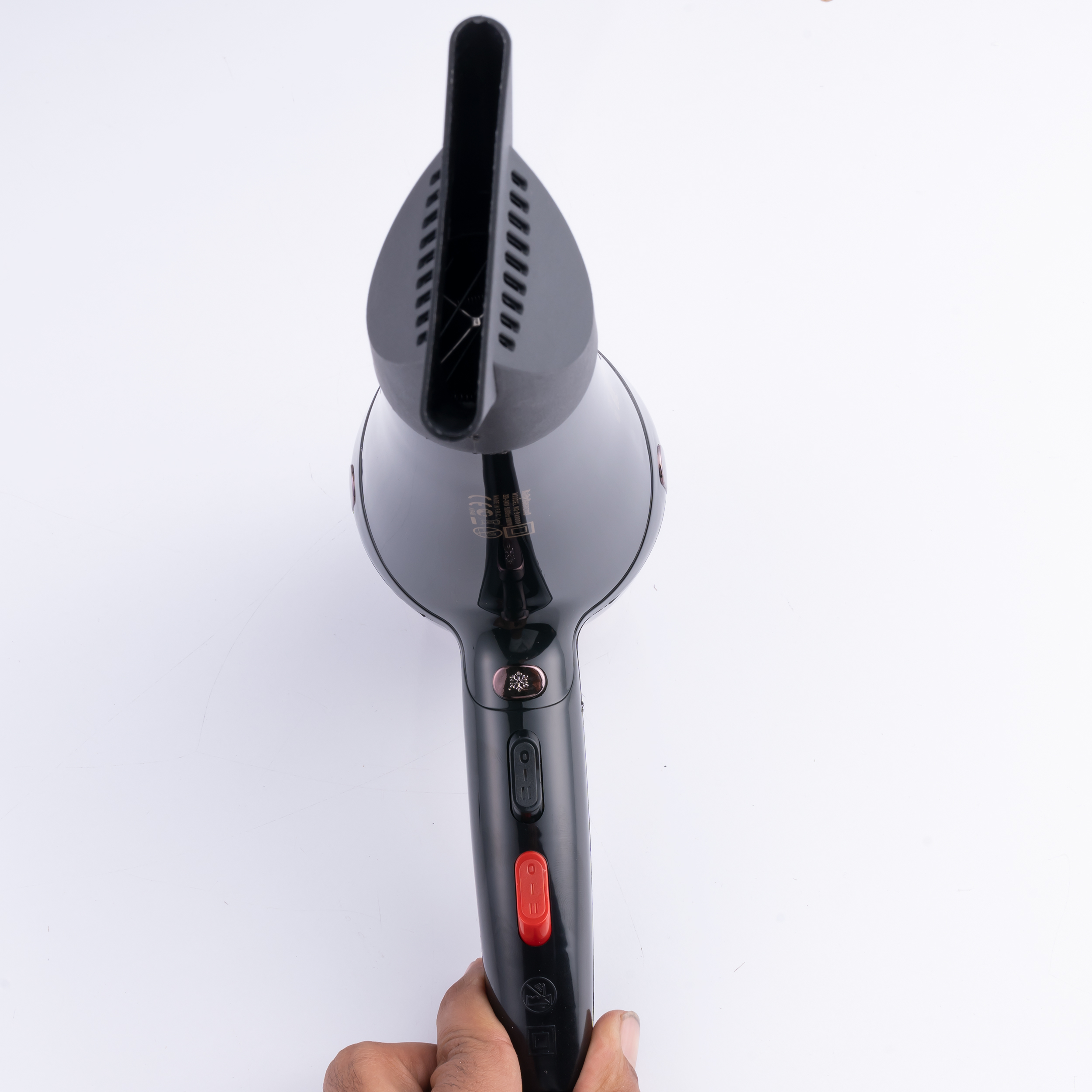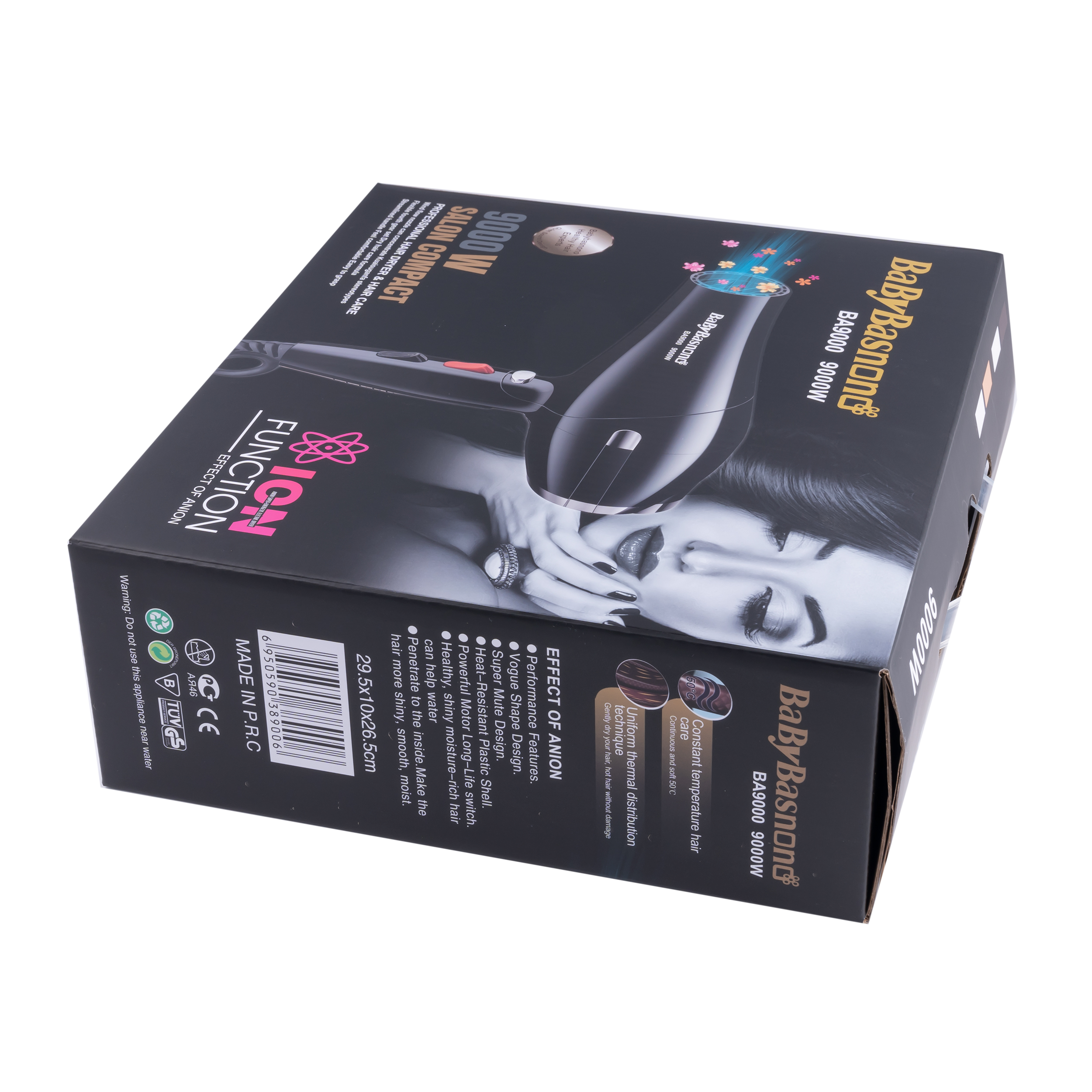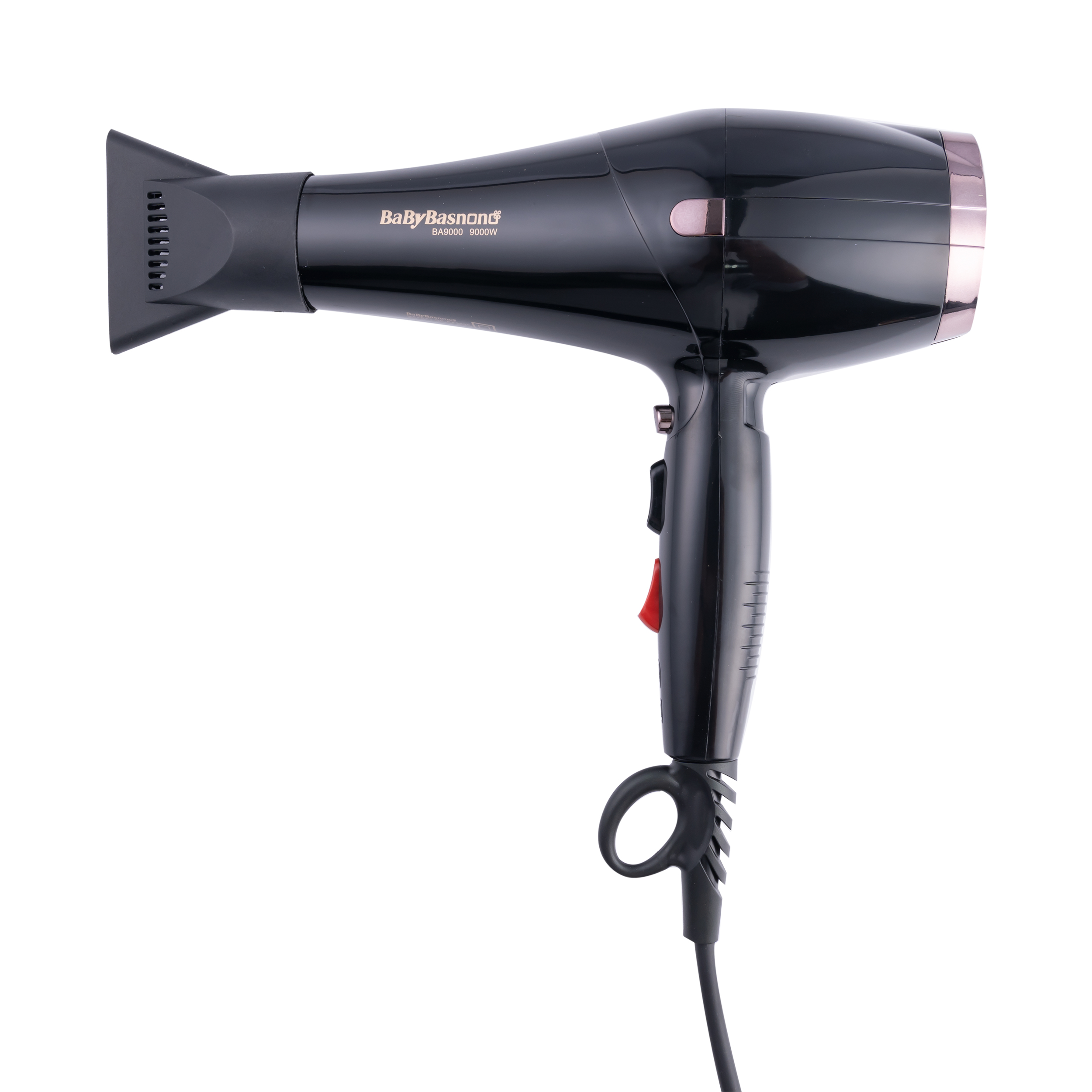 سشوار بیبی باس نانو مدل BA9000 دارای موتور AC با توان 9000 وات است. المنت به کار رفته در این سشوار از جنس پیشرفته بوده و باعث میشود تا موها ظاهر ابریشمی و لطیف پس از خشک کردن داشته باشند. موتور سشوار بیبی باس نانو AC بوده و در کنار قدرت فوق العادهای که دارد صدای زیادی را نیز تولید نمیکند و به وسیله آن میتوانید موهای خود را خیلی سریع خشک و حالت دهی کنید. شما میتوانید سرعت باد سشوار را در دو حالت و حرارت آن را هم در دو حالت متفاوت تنظیم کنید. با فعال کردن باد سرد المنت به صورت لحظهای از کار میافتد تا شما بتوانید به کمک آن حالت بخشی از مو را تثبیت کنید. همراه این سشوار 2 عدد متمرکز کننده برای ایجاد فشار بیشتر ارائه شده است. گفتنی است فیلتر هوای سشوار را میتوان از آن جدا و تمیز کنید. همچنین این سشوار دارای چراغ روشنگر LED بوده و مجهز به سیستم تولید یون نیز است که باعث میشود مو با سرعت بیشتری خشک شود و در نتیجه آسیب کمتری به مو وارد میشود. به دلیل بلند بودن کابل این سشوار که در حدود 2.1 متر است، برای استفاده در سالنهای آرایشی بسیار مناسب بوده و روی دسته آن نیز حلقهای جهت آویزان کردن آن وجود دارد.
